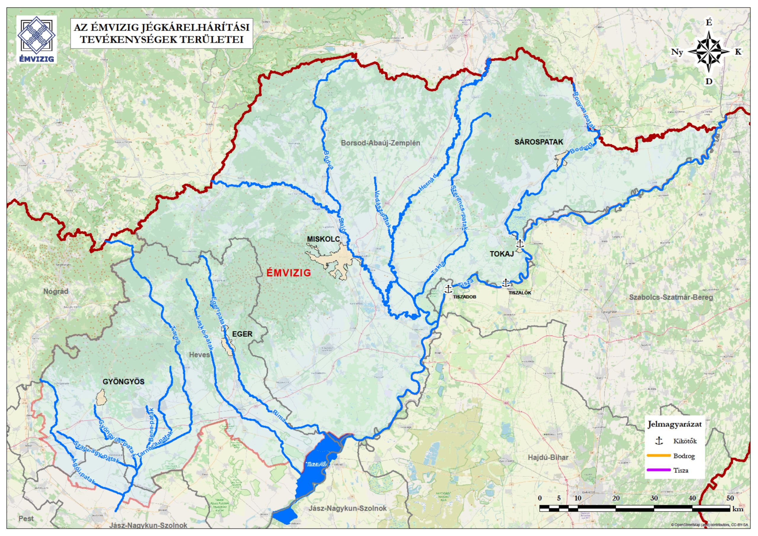 - a Bodrog Tokaj, torkolat (0,000 fkm) - Felsőberecki, magyar-szlovák országhatár (51,100 fkm) közötti ÉMVIZIG kezelésű folyószakaszokon.